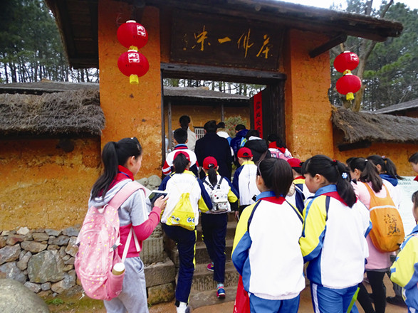 坐上载满欢乐的“绿皮火车”,旅程就开始了!讲解员姐姐带着大家从茶渡口出发,路上还介绍了茶马古道的故事,很快,就来到了第一站——“古佛堂”。过了茶树桥,接着进入写着“茶佛一味”古庙,这是一个用黄土制作而成的寺庙。院里有一个水缸,讲解员姐姐说,这个水缸是用来聚银聚宝的,也可以用来收集雨水从而防止火灾的发生。“我们的老祖先真有智慧呀!”杏花村小学的叶子隽不禁感叹。