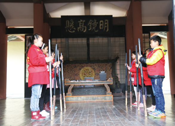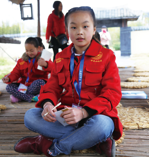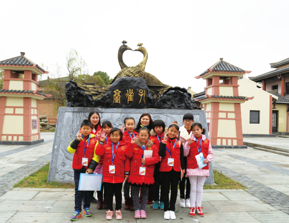 学生记者学习古时读书盘腿而坐 小记者们于孔雀台前合影