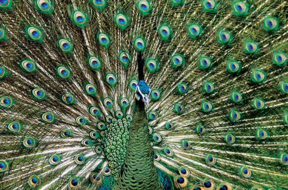 如果你能近距离观看绿孔雀,会更加深刻感受到它们的魅力:虽然叫“绿”孔雀,但这种鸟身上的羽毛可不仅仅是绿色,它可以随着光线角度的不同呈现从翠绿、蓝绿、到古铜、金黄变化无穷的金属光泽,魔幻又迷人。