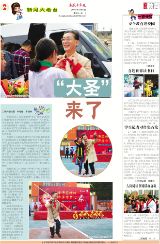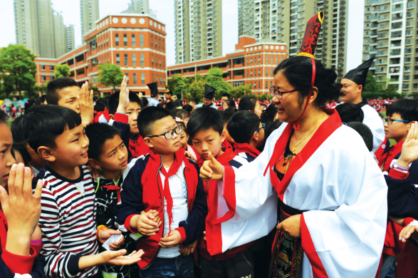 4月17日,合肥师范附小三小启动“阅读经典 诗意生活”古诗词读书周,迎接“世界读书日”。为激发全校小学生阅读中华经典国学的热情,该校老师身穿古装扮成古代人,“穿越”在校园里向学生提问有关古诗词的考题,凡是能回答正确的学生都能获得一份精美奖品。