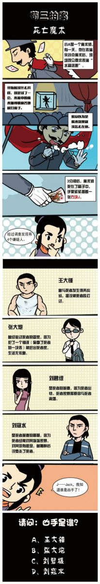 答案下期揭晓 上期答案(2017年5月22日第八版)B。他有3个孩子,他怎么知道是富贵死了呢?所以他一定是在警察通知之前就知道了,却装作不知道,富贵的死一定和他有关系。