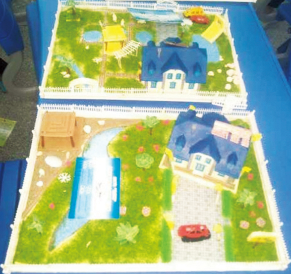 “在我的想象中,巴黎春天,应该有盎然春色和浪漫的景致。”于是,尹芊冉在脑海中,勾勒出绿油的草坪、蜿蜒的小河。蓝瓦、白墙、灰檐的小屋,也是整个建筑的主要一景。屋顶上装有一台太阳能,节能环保,是用纸盒剪制而成。后花园中,除了一座长满青苔的假山,还建有一架风车。有山有水,怎能没有树呢?于是,她又种上绿树和红花。看!一片春色盎然。