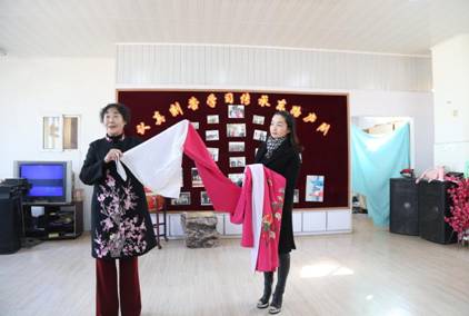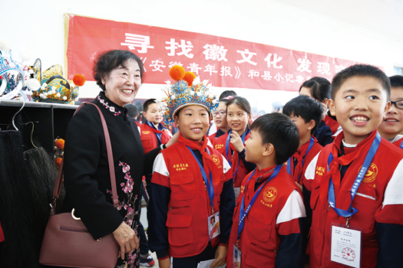 王奶奶精神矍铄,讲的幽默精彩,小记者们听得认真,记得仔细。原来王奶奶从19岁就进入和县庐剧团,到现在有55年了,依然活跃在庐剧舞台上。听到这,小记者都情不自禁地竖起了大拇指。赵悦说,“这种持之以恒的精神值得我学习,我在心里给王奶奶敬了一个少先队队礼!