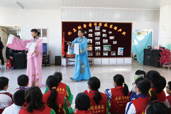 待另一位东路庐剧的老前辈罗兴柱爷爷,分享了他的“庐剧”故事之后,和县庐剧团的张国胜叔叔和武燕阿姨,为大家现场表演《梁山伯与祝英台》的经典选段“十八里相送”。小记者们席地而坐,屏住呼吸欣赏着。