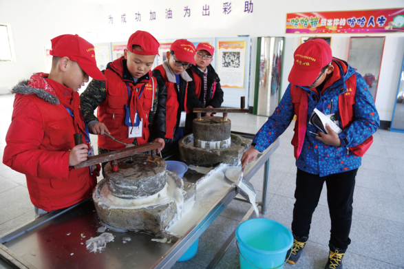 到了磨豆浆环节,学生记者们飞奔到石磨旁,撸起衣袖,添豆、转磨、盛豆浆,忙得不亦乐乎。看着牛奶般的豆浆,顺着石磨缝流了出来,胡丁洋不禁咽了咽口水。因为磨得太久太费力,他的手还磨出了一个水泡。必须得逆时针转,哎!想喝上一杯豆浆,还真不容易。不少学生记者还暗自庆幸道:嗯,幸好现在有自动豆浆机。