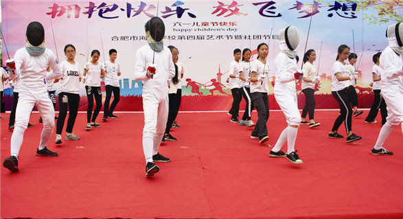 击剑是从古代剑术决斗中发展起来的一项体育项目,它结合优雅的动作和灵活的战术,要求运动员精神的高度集中和身体的良好协调性,体现出运动员良好的动作和敏捷的反应。合肥市海顿学校于2017年4月份成立击剑社团,当时有60多名同学报名参加击剑社团,参加选拔学生的年龄段为五年级至八年级的学生,通过对报名同学们体能、灵敏度、耐力的考察,最终有30名同学成为击剑社团成员。