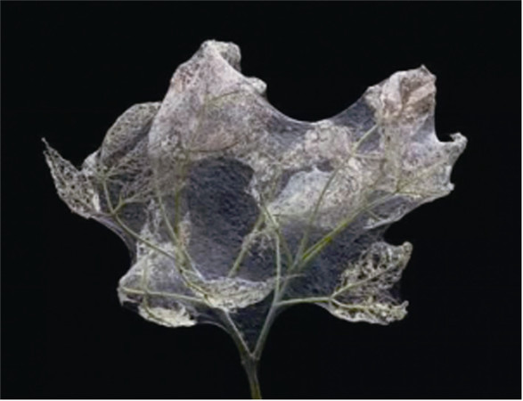 这个丝状巢穴,粗看感觉平淡无奇,细看会发现亮点。同学们注意观察植物的叶子,是不是发现叶肉没了,只剩下叶脉!这是圆掌舟蛾幼虫的杰作,和许多蛾子的幼虫一样,圆掌舟蛾的幼虫会“吐丝”,但是它们知道叶脉可以用来固定丝线,于是吃的时候多留了一个“心眼”!
