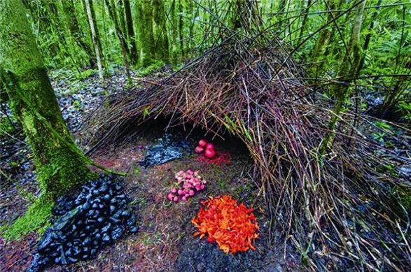 “结婚这事儿,与房子的关系甚大”,这个准则好像也适用于动物界哦。雄性园丁鸟需要用自己高超的建筑技巧来吸引异性:用树枝和杂草建造一个小亭子,并在周围艺术性地摆满各种浆果、甲虫、花等装饰品。但讽刺的是,这仅仅是一种“考验”,雌性园丁鸟并不在这个小房子里哺育后代。