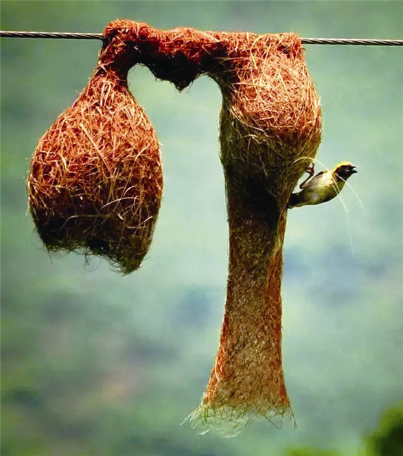 织布鸟是鸟类乃至动物中最优秀的纺织工。非洲织布鸟的巢,是最大的公共巢,有300多个巢室。远远看起来,就像是巨大的梨还拖了一根管道!黄胸织布鸟,擅长使用植物纤维,并仅凭一只喙来完成筑巢。这个工程量巨大,耗时也很惊人。