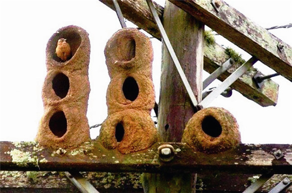 红灶鸟是阿根廷的国鸟。它们的椭圆形巢穴,用粘土和泥巴等搭建而成,在干燥后呈红色,坚硬结实,形状像一座炉子,被当地人称为“面包烤炉”,红灶鸟也因此被称为“面包师”。每个“烤炉”的平均重量在3~5公斤——如果从高处掉落正好砸着人,估计这人是要受重伤的!巢门永远朝北,能躲避从南方吹来的暴风雨。造这种巢穴,一只鸟需要飞行大约2000次。