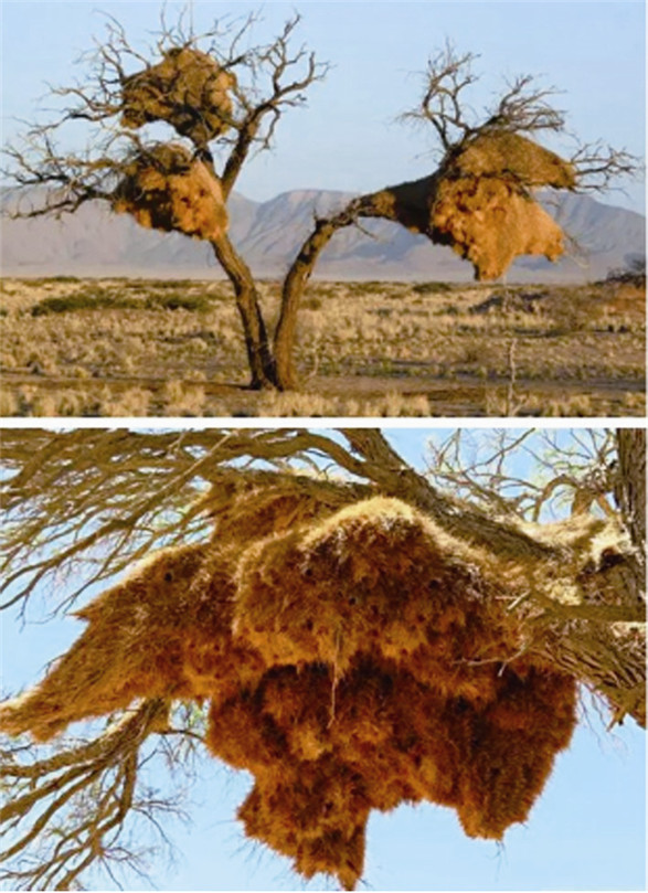 群居织巢鸟分布于半干旱的纳米比亚和南非平原地区,它们的巢穴是以树枝、干草为材料的永久性居所,有些使用年限可达100年之久,可容纳几代数百只鸟共同居住。内部的每个房间都是独立的,互不相通,冬季保暖效果显著。较大的巢穴组合长约6米,宽约4米,一些大树会因为无法承受其重量,而被压弯、压垮。