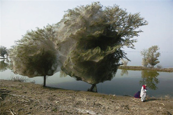 2010年前后,巴基斯坦曾经发生过洪涝灾害,很多昆虫无处藏匿。无奈之下,部分蜘蛛选择在树上织网,最后竟然有了这样的奇观!远远看去,这些树好像是自带迷雾效果!