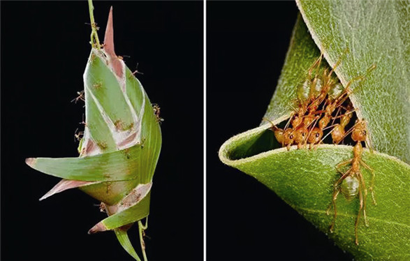 缝叶蚁生活在东南亚和澳大利亚热带森林的边缘地区,它们不在地面上建造巢穴,而是利用高挂在树上的叶子织巢。它们本身不会吐丝,而是利用幼虫产生的丝穿“针”引“线”,将树叶粘在一起,缝制出精美的蚁巢。根据树叶的大小而建筑出的巢穴也是大小不一,最长的可达半米。