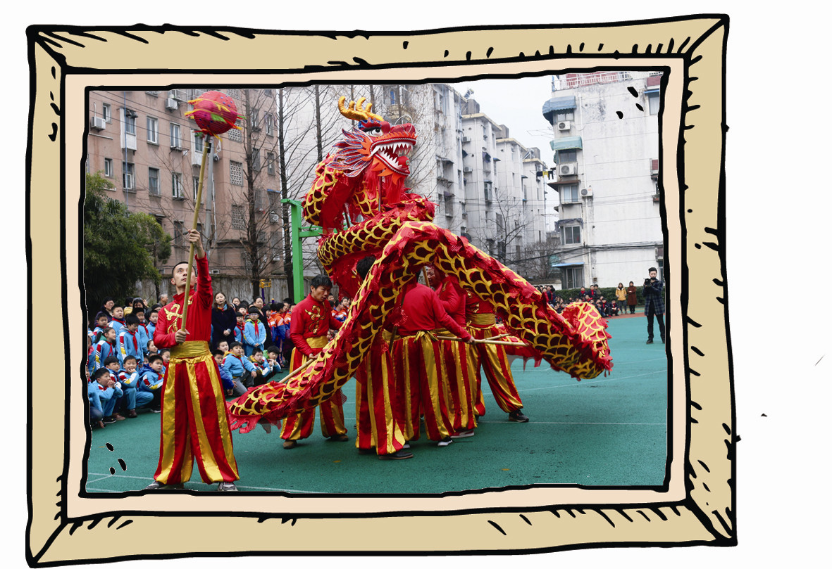 在民俗活动中,最受同学们欢迎的当属精彩的舞龙舞狮表演,表演结束后应他们的要求,一部分同学有机会跟着专业老师学习舞龙舞狮,同学们别提有多开心了。在专业老师的讲解中,同学们知道了舞龙舞狮的意义、“南狮”“北狮”的差别以及基本的动作技巧等。接下来,就是同学们展示的时刻了。没想到,刚学了十几分钟的同学们“耍”得有模有样,“长龙”飞起来了,“雄狮”跳起来了,还调皮地眨了眨眼睛……当小J问起他们难不难掌握时,作为学习舞龙搭档的戴左尧和黄煦宸同时说道:So easy!举着龙头的黄煦宸说:“龙头虽然很重,但只要用里面的杆巧妙地撑起来,也没那么重了。”