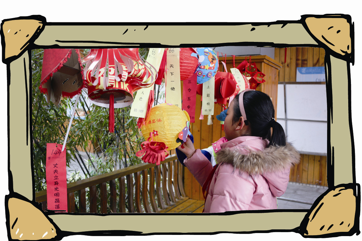 此次“情浓元宵 乐赏花灯”元宵节庆祝活动恰逢同学们刚开学不久,他们纷纷带来了大大小小、形状各异的自制灯笼。校园里到处挂满了同学们的作品,一排排灯谜在教学楼下迎风飘扬,校园里洋溢着浓浓的节日气氛。