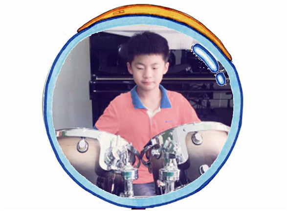 王振宇喜欢节奏感十足的摇滚乐。上一年级时,他在电视上看到别人敲架子鼓,觉得很酷,便开始学起来。虽然期间因为各种原因,将学架子鼓这事中断了,但王振宇内心的热情依旧不减。这不,在三年级暑假时,他又重新学起来了,并一直坚持着。现在,每个周末,他都去上一节课。