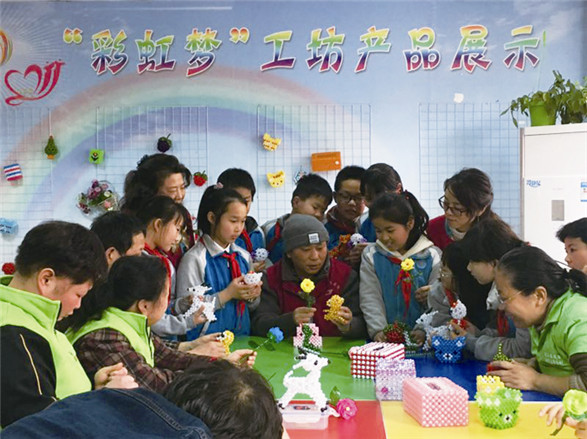 近期,马鞍山市育才小学开展了“学雷锋,争当志愿者”活动。期间,该校四(3)班红领巾志愿者们在朱春艳和金晶两位老师的带领下,来到马鞍山市宁南社区的“彩虹梦工坊”,和入选“中国好人榜”的傅强及爱心人士郭幼兰一起,陪伴彩虹梦工坊人员学做手工。在工作人员的指导下,小志愿者们用串珠制作了精致的花篮、笔筒、纸巾盒等。活动结束,孩子们纷纷用自己的零花钱购买了工坊人员已经编织好的花、笔筒、纸巾盒等,在那里度过了一个快乐而又有意义的下午。