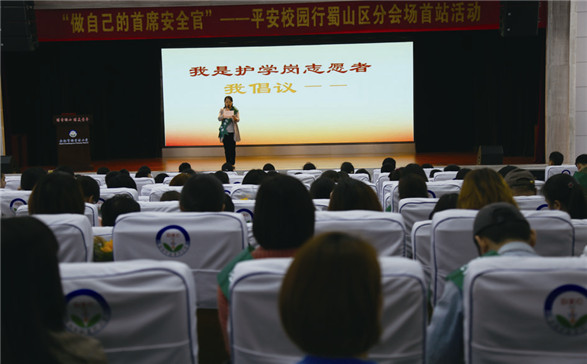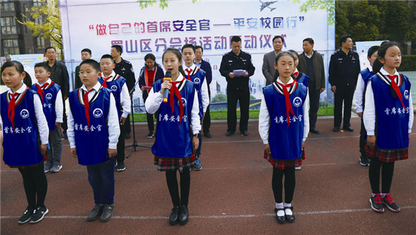 “生命第一,安全第一;多一分防范,少一分危险。”“让我们一起‘做自己的首席安全官’!”今年3月26日,是第23个全国中小学生安全教育日。在这个特殊的日子里,“做自己的首席安全官——平安校园行”蜀山区分会场活动启动仪式及首站活动在稻香村小学举行。本次活动的启动仪式由蜀山区教育体育局局长王雪梅阿姨主持。蜀山区人民政府副区长李卫叔叔、区公安分局副局长李德胜叔叔、区交警蜀山大队大队长陶亮叔叔、区消防大队队长蒋健叔叔、区安监局副局长孙葆林叔叔、区市场监管局李雷叔叔以及蜀山区各中小学校长、幼儿园园长、稻香村小学全校师生和200多名家长志愿者参加了本次活动。 开启安全校园活动,“做自己的首席安全官”!活动中,陶亮叔叔和李德胜叔叔先后围绕“识别道路交通标志、遵守好交通规则”“增强安全意识、提升安全防范能力”等主题,为师生们讲解了校园治安防范、校园消防安全和交通安全等方面的知识。李卫叔叔在讲话中指出,“安全教育重于泰山,师生生命健康高于一切。”他要求各中小学、幼儿园提高认识,树立“隐患就是事故,事故就要处理”的理念,高度重视学校教育教学各个环节的安全保障,把安全教育纳入课程、深入课堂,开展丰富多彩、注重实效的安全教育主题实践活动。