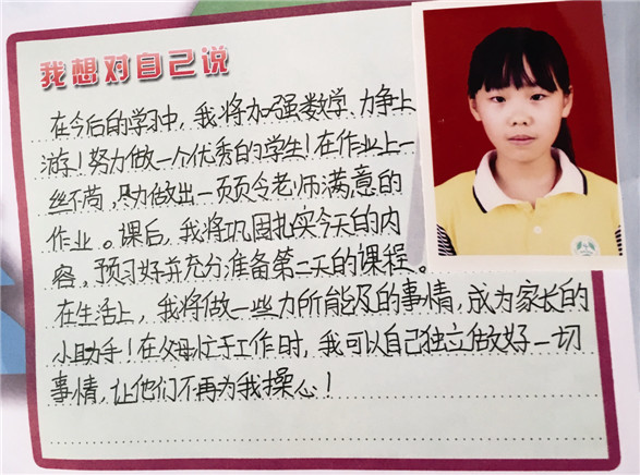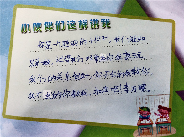 四村小学同学们的《成长》手册和普通的评价手册有很多不一样。在《成长》手册封面上,每学期都有黎林春校长热情而又充满智慧的寄语。“成长数据”让同学们动手自己测量,更加关注自己;“老师眼中的我”让同学们和老师进行心与心的对话;“五佳闪光记录”让同学们记载成长进步中的一个个脚印;“还有很多令人难忘”让同学们自己记忆成长中的难忘瞬间;“爸爸妈妈眼中的我”“小伙伴们这样讲我”从多元的角度勾勒同学们成长的轨迹;“我想对自己说”让同学们回想和展望自己成长的心路历程。在《成长》手册中,一句句真实、生动的文字,让同学们看到一个全新的自己,独特的自己,“我就是我,是颜色不一样的烟火!”
