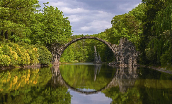 魔鬼之桥。这座桥位于德国克罗姆劳公园内,该桥完美的抛物线和玄武岩尖顶,使其获得了“魔鬼桥”的称号。无论观察角度如何,桥梁和水中的倒影,都会组成一个完美的圆,这得益于独特的施工精度。根据当地的神话传说,建造者为了让魔鬼帮助建成此桥,甚至不惜牺牲自己的生命。春季杜鹃花开时节,此处风景尤其美丽。(图/彼得·希尔德)