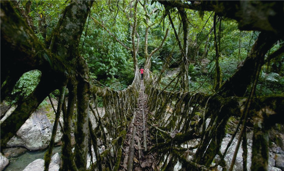 取材于自然的活树根桥。顾名思义,这座位于印度的桥,是由原生的、活着的树根做成的,因此洪水也奈何不了它。该桥在印度Nongriat,这里是世界上最湿润的地区之一,丛林中充满瀑布、蜂房和槟榔树。数百年来,当地卡西族人,用印度橡胶树的树根,来编织这种桥,人们也就可以以此应对季节性洪水。这座正在编织的三层活根桥,预计可以使用数百年,能够同时支撑50个人的体重。(图/亚历克斯·特雷德韦)
