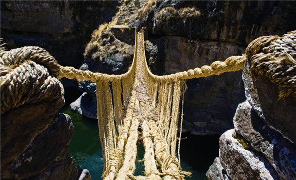 有胆你就来之秘鲁草绳桥。这座桥名为Q‘eswachaka,横跨峡谷约38米,更不可思议的是,这座桥已接力式的存在了500年。说它是接力式的存在,是因为每年6月,当地的建桥者埃莱乌特里奥·卡洛·塔皮亚和邻居们,就聚到一起,解开该桥,然后再用当地的一种草编织出一座新桥。(图/维柏特·罗斯)