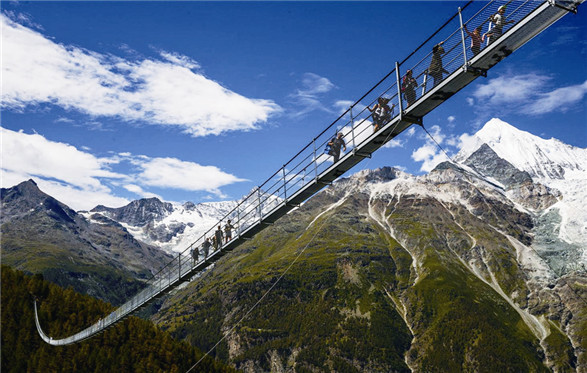 天空漫步之查尔斯吊桥。这座名为Charles Kuonen的吊桥,长约490米,位于瑞士瓦莱斯州策马特,这是世界上最长的悬架人行桥。马特洪峰的景色虽美,但是当你想到,站在桥上的你距离桥下的河谷有85米时,你可能就没有闲情逸致去欣赏风景了。