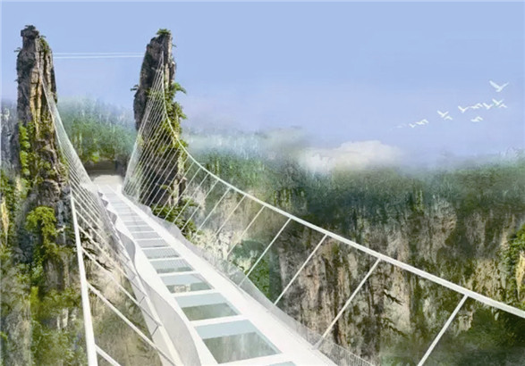 张家界大峡谷玻璃桥。它是世界上最长、最高的全透明玻璃桥,主跨430米,桥面长375米,宽6米,桥面距谷底约300米,为世界首座斜拉式高山峡谷玻璃桥。该桥创造了大跨度没有抗风缆等多项世界之最。其突出特点是:无钢筋混凝土桥墩,桥面全以钢化防滑透明玻璃铺设,桥面上放置玻璃球起到遏制振动的效果。