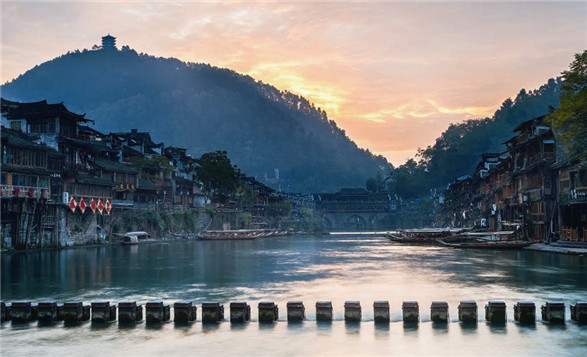 意境清幽之石头桥。中国凤凰古城的石头桥,是由埋入式石头筑成的,该桥横跨沱河。图片纵深处为凤凰古城虹桥,这是一座有三个拱门的亭桥。虹桥二楼的茶楼有舒适的藤椅,坐在茶馆中,就可以观赏河边的吊脚楼和划龙舟比赛。(文图综合自科普中国、百科知识)