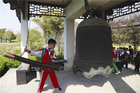 在三十一响钟亭里,悬挂着一口古钟。取名三十一响,是用以祭奠项羽31岁的短暂而辉煌的人生。听着钟声响起,不少同学都撸起袖子,跃跃欲试。钟声绕梁,在空中尚未停息,陈欣淼又和同学们一起,来到了让她印象最为深刻的享殿。享殿里供奉着一尊2.6米高的仿青铜霸王立像。“看,这就是项羽,他相当于现在一个1.8米的人……”看着雕像,再听着导游的解说,张奕鸣像穿越了时空一般,他说:“我仿佛看到霸王项羽,在战场上英勇杀敌的场景。”人群中,也有人说:“霸气外露,我仿佛能感受到他那高傲的气节!”