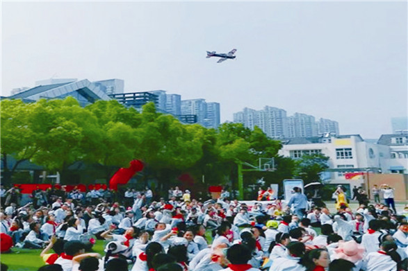 “轰隆隆……轰隆隆……”在一阵震耳欲聋的轰鸣声中,一架歼十KT机和一架F3P特技3D机,盘旋在同学们的头顶上,并开始了它们的表演。翻滚、俯冲、圆周、筋斗、巡航……一整套真机动作漂亮的完成,现场嗨翻一片,掌声、欢呼声此起彼伏。