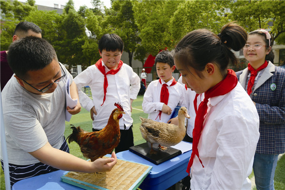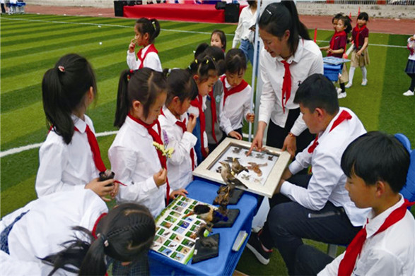 活动现场,来自安徽大学生命科学学院的两位大学生志愿者,为小学生介绍起剥制标本的特色和科学制作过程。看着栩栩如生的鸡、鸭、猫标本,同学们啧啧称奇。在感知科技魔力种子展台,不少同学席地而坐,用绿豆、红豆等植物种子和其他材料,当场制作出一幅作品。