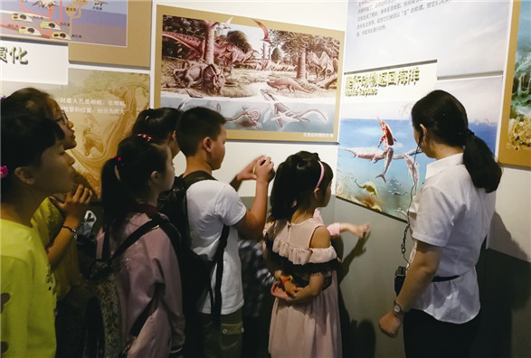 在生命演化厅里听沉睡亿万年的化石诉说生命进化的神奇,以地质时间为线索,按生命演化的各个阶段分别介绍地球上生命起源、发展和演化的过程,同学们了解到了蓝田生物群、巢湖鱼龙及带毛恐龙等化石。