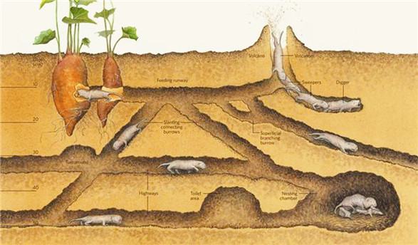 裸鼹形鼠地下生活示意图,巢穴大的可以延伸到三千米,里面的洞穴各有特定用途,比如专门的厕所洞,专门的育幼洞等等。