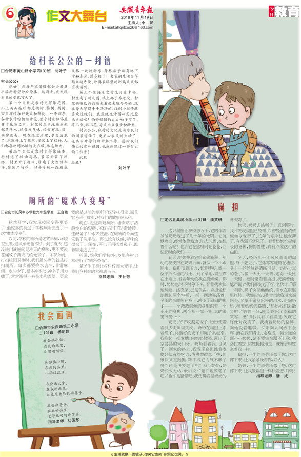 □合肥市黄山路小学三(3)班 刘叶子 村长公公: 您好!我每年寒暑假都会去歙县丰源村看望外公外婆。这两年,我发现村里的变化可大了。 第一个变化是农村变得像花园。山上满山遍野都是桃树、梅树、梨树。田里种植各种蔬菜和鲜花。一年四季,各种农作物相继开花,整个村庄仿佛置身于花海之中。村里的三口池塘原来都是污水,还散发气味,经常有鸡、猫、狗掉进去。现在经过治理,水变清澈了,周围种上了花草,安装上了栏杆,人们都喜欢到池塘边洗衣服,休息聊天。 第二个变化是农村变得像城市。村村通了柏油马路,家家安装了网络。村里开了超市,修建了大型停车场、休闲广场等。旧房子统一改造成风格一致的新房,每栋房子都有地下室和车库,漂亮极了!大家的生活变得越来越方便,外婆家隔壁的阿姨天天都有快递呢。 第三个变换是农村生活更幸福。村里有了幼儿园,镇上办了养老院。村里的哑巴叔叔原来看起来脏兮兮的,现在每天穿得干干净净的,碰到小孩子就喜欢逗他们。我想他生活得一定比原来幸福吧!雨婷姐姐的太太90多岁了,耳不聋,眼不花,每天出来散步和聊天。 村长公公,农村的变化是因为我们的国家富强了,更关心农民的生活了,也离不开你们的辛勤工作。感谢我们伟大的党和祖国,也感谢像你一样付出的工作者! 此致 敬礼! 刘叶子