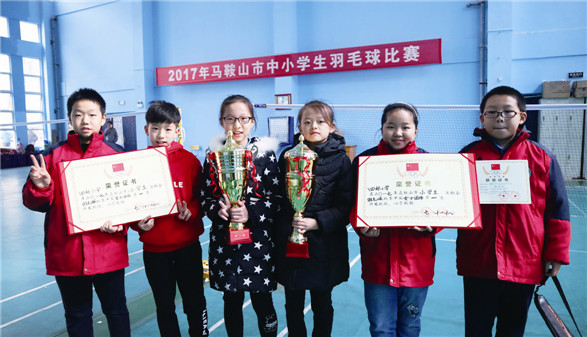 □小 J 魅力社团 马鞍山市四村小学羽毛球社团 在马鞍山市四村小学的羽毛球社团有一支羽毛球“翔之队”。羽毛球“翔之队”飞得高,飞得那样引人夺目。六年前,社团刚刚成立的时候,“翔之队”的同学们就像一根根“豆芽菜”,每周一、三、五下午两节课后,同学们一个个拎着长长的羽毛球拍来到学校的羽毛球馆,就像故事里小小的“儿童团员”扛着长长的红缨枪一样。他们在教练员的口令下,从最简单的动作,拉开架式,一遍又一遍地重复着基本动作。这哪里是练羽毛球?简直就是武侠小说里练“蹲马步”么!枯燥,十分的枯燥。然而,坚持!同学们用自己的汗水深刻理解了什么叫“贵在坚持”。刘铠瑞同学在完成一次干脆漂亮的“劈杀”决胜对手后,深有感触地对教练说:“曲教练,我不是打赢了对手,我是战胜了自己!” “宝剑锋从磨砺出,梅花香自苦寒来。”四村小学的羽毛球“翔之队”通过两三年的蛰伏,最后“异军突起”,在历次全市小学生羽毛球比赛中,俨然“横刀立马”“所向披靡”。尤其是在2017年和2018年,这支团队包揽了男、女单打,男团、女团的第一名,让对手们望背兴叹。马鞍山市四村小学教育集团王永红校长称赞道:“同学们,你们热爱羽毛球运动,你们在球场上奋力拼搏的矫健身姿,你们挥拍击球时的一声声呐喊,就是雏鹰在昂扬起飞、欢快清鸣!” 赛场上,这是一支“嗷嗷叫”的队伍。赛场下,他们团结协作组成小志愿者,自主分工,定时清理和管理训练场地。课间活动期间还转身成了“严厉”教练,为羽毛球感兴趣的同学当起了指导。“挥拍没到位!你当是捉蚊子啊!”“想打好羽毛球么?那就要做好流大汗的准备!汗淌多少,球就打得有多好!明白了没有?!” 小小的白色羽毛球,飞起的是同学们的美好梦想。球场上不断闪现的身影,那是雏鹰起飞前的振翅。