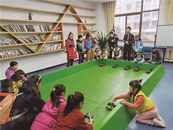 “看我的厉害!”“哼,别想进球,我来挡!”……比赛中,学生记者不停转动手中的遥控器,灵活控制场地上的智能小车左转右移。岳胤泽首先进球,大大鼓舞队员的士气。“这个游戏我是第一次玩,比较注重团队协作能力,还有动手操控的能力。其实,我和其他队友同校不同班,平时交流比较少,这次组队比赛,拉近了彼此的距离,我觉得挺好。”他还说,平时在学校,自己有学一些编程小游戏,可以开拓思维,也能缓解一下学业压力。