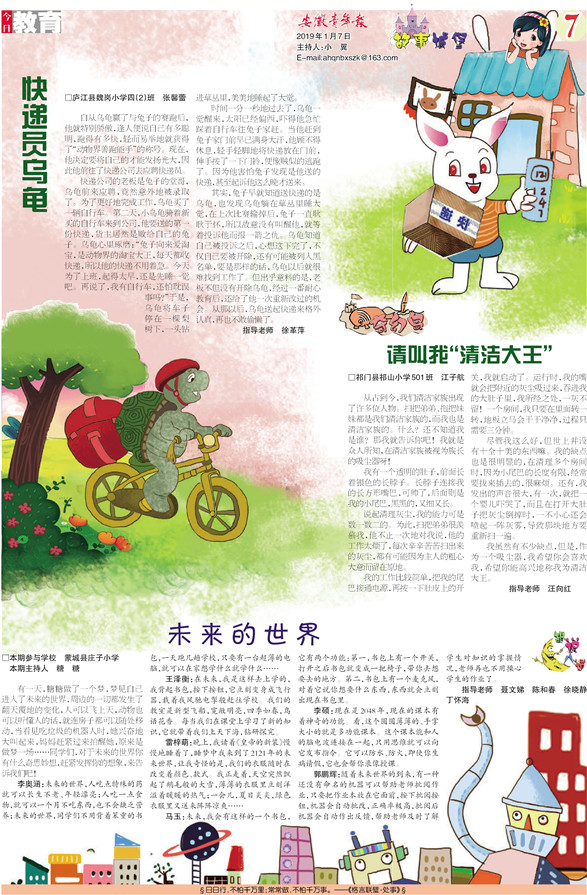 □庐江县魏岗小学四(2)班 张馨蕾 自从乌龟赢了与兔子的赛跑后,他就特别骄傲,逢人便说自己有多聪明,跑得有多快,轻而易举地就获得了“动物界善跑能手”的称号。现在,他决定要将自己的才能发扬光大,因此他前往了快递公司去应聘快递员。 快递公司的老板是兔子的堂哥,乌龟前来应聘,竟然意外地被录取了。为了更好地完成工作,乌龟买了一辆自行车。第二天,小乌龟骑着新买的自行车来到公司,他要送的第一份快递,货主居然是败给自己的兔子。乌龟心里琢磨:“兔子向来爱淘宝,是动物界的淘宝大王,每天都收快递,所以他的快递不用着急。今天为了上班,起得太早,还是先睡一觉吧。再说了,我有自行车,还怕耽误事吗?”于是,乌龟将车子停在一棵梨树下,一头钻进草丛里,美美地睡起了大觉。 时间一分一秒地过去了,乌龟一觉醒来,太阳已经偏西,吓得他急忙踩着自行车往兔子家赶。当他赶到兔子家门前早已满身大汗,他顾不得休息,轻手轻脚地将快递放在门前,伸手按了一下门铃,便像贼似的逃跑了。因为他害怕兔子发现是他送的快递,甚至起诉他这么晚才送来。 其实,兔子早就知道送快递的是乌龟,也发现乌龟躺在草丛里睡大觉,在上次比赛输掉后,兔子一直耿耿于怀,所以故意没有叫醒他,就等着投诉他而报一箭之仇。乌龟知道自己被投诉之后,心想这下完了,不仅自己要被开除,还有可能被列入黑名单,要是那样的话,乌龟以后就很难找到工作了。但出乎意料的是,老板不但没有开除乌龟,经过一番耐心教育后,还给了他一次重新改过的机会。从那以后,乌龟送起快递来格外认真,再也不敢偷懒了。 指导老师 徐革萍