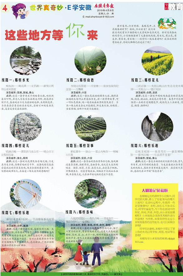 在刚刚过去的清明节小长假中,同学们的大脚,踏上了安徽省内的哪片土地呢?在游玩过程中,有遇到一些奇异趣事吗?来吧,独乐乐不如众乐乐,同学们拿起笔,写下你在旅途中的所见、所闻、所感、所想,向小米姐姐砸稿吧!小米姐姐会选取优秀稿件进行刊登哦!当然啦,如果你曾经走过小米姐姐推荐的这些地方,也可以来稿分享哦!