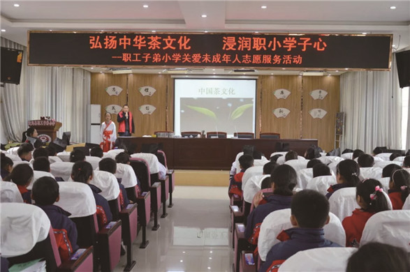 定远县职工子弟小学 弘扬中华茶文化 □郑晓娣 魏 松 李广琴 “弘扬中华茶文化,浸润职小弟子心。” 茶艺课是定远县职工小学的特色课程之一。4月8日,定远县职工子弟小学开展主题关爱未成年人志愿服务活动。该校的志愿者老师为小学生们上了一堂茶艺课,让学生们大开眼界。 茶艺课上,学生们穿戴着中华传统服饰,在古典音乐氛围中听着茶艺老师讲解茶的起源、分类、功效等知识,并学习了茶具的摆放、茶艺手法,以及泡茶、敬茶等礼仪。在茶艺老师的指导下,学生们现场为老师、长辈奉茶。