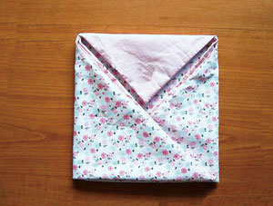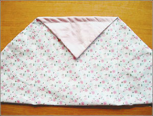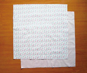 1,取边长为40厘米的花布、素色布各一块,将它们正面相对缝合,留下一个小口不要缝。