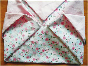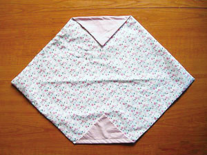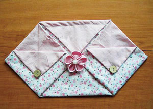 8,另一边也依样折叠,中间缝上小樱花,这样三个尖角都固定住了。