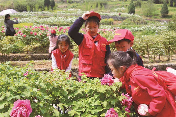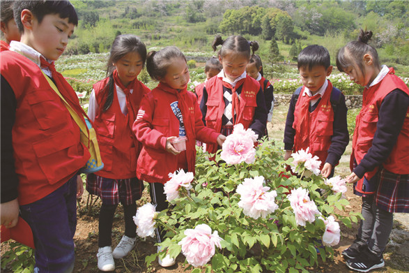 整个景区犹如一个美丽的大花园,漫步在花园中,微风吹过,牡丹花的香味扑面而来。四(1)班王嘉乐走近一闻,啊,真香!他不禁想:用国色天香这一词来形容牡丹真是一点也不为过。牡丹不仅作为观赏性植物,而且还具有一定的药用价值。六(3)班杨舒羽说,有史料记载,铜陵牡丹种植始于晋代,距今已有1600余年历史。