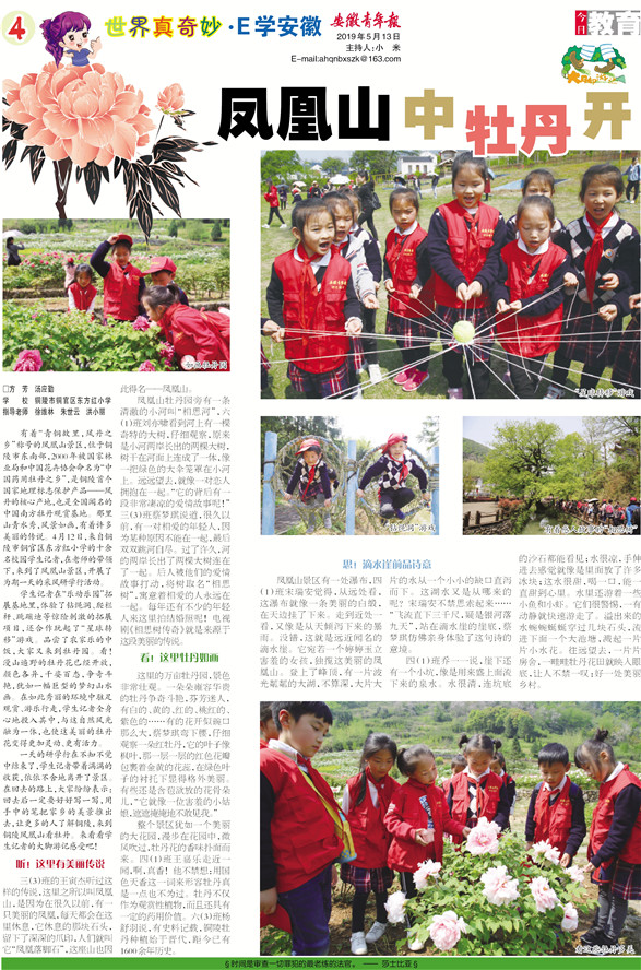 有着“青铜故里,凤丹之乡”称号的凤凰山景区,位于铜陵市东南部,2000年被国家林业局和中国花卉协会命名为“中国药用牡丹之乡”,是铜陵首个国家地理标志保护产品——凤丹的核心产地,也是全国闻名的中国南方牡丹观赏基地。那里山青水秀,风景如画,有着许多美丽的传说。4月12日,来自铜陵市铜官区东方红小学的十余名校园学生记者,在老师的带领下,来到了凤凰山景区,开展了为期一天的采风研学行活动。