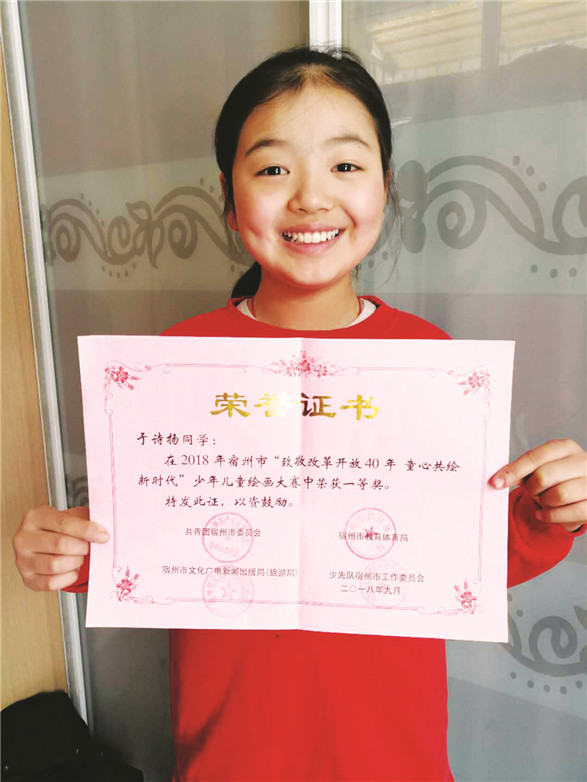 □严 静 李 明 嗨,大家好!我叫于诗扬,今年10岁了。我是一个善良、活泼、爱学习、爱幻想的女孩。在家里,我懂事孝顺;在学校,我是老师得力的小助手,优秀的少先队员,班里的“三好学生”。我有广泛的兴趣爱好:画画、演讲、写作、舞蹈……通过努力也取得了不少殊荣:宿州市“致敬改革开放40年,童心共绘新时代”少儿绘画大赛一等奖;砀山县红领巾“小喇叭”讲解员大赛三等奖;“十三届课堂内外杯创新作文大赛”三等奖;第五届“梦想杯”全国青少年儿童美术大赛金奖………每当有人问我为什么会这么优秀时,我总是对他们灿然一笑说:是梦想赐予我的力量! 因为有梦想,我会时刻严格要求自己,一定要努力成为新时代全面发展的好少年。在众多爱好中我最喜欢画画。它可以让我在天马行空的想象中放飞自己,在五彩缤纷的色彩中释放压力。虽然有时候看到小伙伴们在周末可以随意玩耍,而自己却要去学画画,就会产生动摇之心;当自己在调色彩过程中总是控制不好,画作屡次失败,有放弃之意时。我总会想起师长的教导:不经历风雨,怎能见彩虹!失败是成功之母,努力付出才能实现梦想!是啊,我的梦想就是想让我的祖国能如同我的画作一样精彩纷呈,我怎能遇到挫折就退缩?每每想到这里,我就会热血沸腾,会更加热爱画画了。 我和演讲的第一次亲密接触是县博物馆招募志愿者,我激动地参加了选拔。当看到既要背诵众多文献资料,又要熟悉博物馆里每个陈列品的来历时。我心里打起了退堂鼓。妈妈对我说:有梦想,就要去努力!还没有前进就先放弃,是胆小鬼的表现。是啊!作为新时代少年不能畏惧退缩。于是我克服困难、熟读资料、查阅历史、练习礼仪姿态。只要付出就会有回报,我如愿当选了砀山县博物馆的志愿讲解员。从开始的退缩到现在可以从容地接待全国各地的参观者,并得到大家的一致好评。这些都是我成长中留下的美好回忆,也是鼓舞我继续前进的动力。 因为有梦想,所以坚持。要实现梦想必须付出汗水和泪水,不甘落后的我一直在努力进取着。都说一分耕耘,一分收获。每当看到自己的画作获得一个个奖项时,每当收到作文大赛及各项比赛的荣誉证书时,每当听到自己的讲解得到省市领导的认可和好评时,我就会更加坚信——这是梦想赐予我的力量。前行的路上,我会继续披荆斩棘乘风破浪勇往直前! 因为有梦想,所以自信。坚定的信念一定会成为实现梦想的力量。正是有了这种力量,我才能不断进步,从容地面对成功和失败。我要为梦想插上理想的翅膀,与同学们一起携手翱翔在祖国的蓝天,把祖国建设得更加繁荣富强!