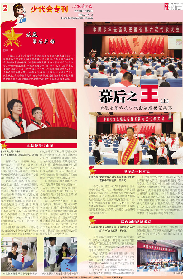 5月31日上午,中国少年先锋队安徽省第六次代表大会(以下简称省第六次少代会)在合肥开幕。会议期间,开展了红色话剧演出、红领巾素质拓展课、“数字解码探发展 童心筑梦新时代”主题队会、“听党的话跟党走 争做江淮好少年”迎“六一”文艺汇演等丰富多彩的活动。“台上一分钟,台下十年功”,少代会的成功举办,离不开幕后团队的精心策划,本期专刊,我们走进幕后,先后采访了少先队员代表、少代会委员代表、晚会导演等,通过他们在幕后的努力拼搏和故事分享,继续传递少代会精神,向新中国成立70周年献礼。