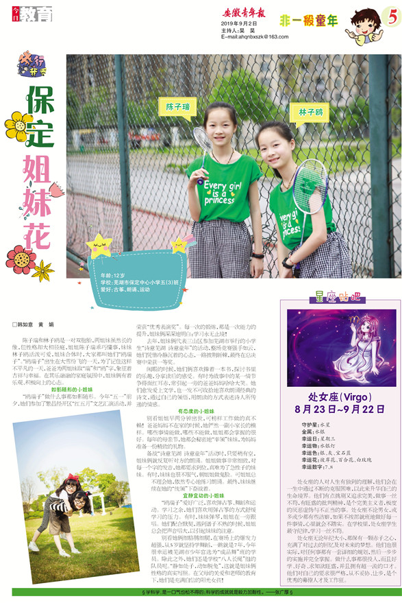 保定姐妹花 陈子瑞 林子鸥 年龄:12岁 学校:芜湖市保定中心小学五(3)班 爱好:古筝、朗诵、运动