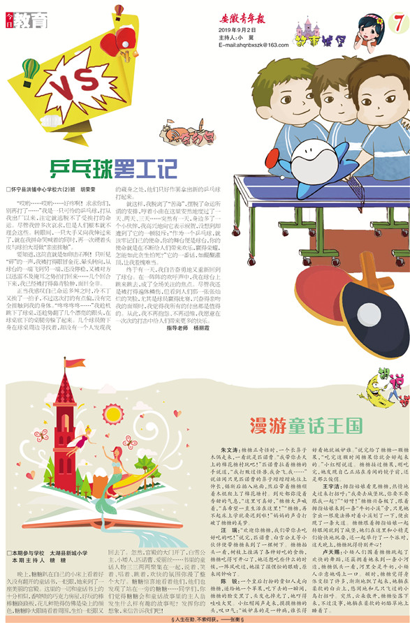 奇幻岛 乒乓球罢工记 □怀宁县洪铺中心学校六(2)班 胡荣荣 “哎哟……哎哟……好疼啊!求求你们,别再打了……”我是一只可怜的乒乓球,打从我出厂以来,注定就逃脱不了受挨打的命运。尽管我曾多次哀求,但是人们根本就不理会这些。转眼间,一只大手又向我伸过来了,就在我拼命哭喊着的同时,再一次硬着头皮与球拍大哥做“亲密接触”。 要知道,这简直就是如卵击石啊!只听见“砰”的一声,我被打得眼冒金花、晕头转向,从球台的一端飞到另一端,还没停稳,又被对方以迅雷不及掩耳之势拍打回来……几个回合下来,我已经被打得鼻青脸肿,面目全非。 正当我感叹自己命运多舛之时,冷不丁又挨了一拍子,不过这次打的有点偏,没有完全接触到我的身体。“咚咚咚咚……”我趁机跳下了球桌,还趁势翻了几个漂亮的跟头,在球桌底下的桌腿旁躲了起来。几个球员俯下身在球桌周边寻找着,却没有一个人发现我的藏身之处,他们只好作罢拿出新的乒乓球打起来。 就这样,我脱离了“苦海”,摆脱了命运所谓的安排,哼着小曲在这里安然地度过了一天、两天、三天……突然有一天,身边多了一个小伙伴,我高兴地向它表示祝贺,没想到却遭到了它的一顿驳斥:“作为一个乒乓球,就该牢记自己的使命,你的舞台便是球台,你的使命就是在不断给人们带来欢乐,赢得荣耀,怎能如此贪生怕死?”它的一番话,如醍醐灌顶,让我羞愧难当。 终于有一天,我自告奋勇地又重新回到了球台。在一阵阵的欢呼声中,我在球台上跳来跳去,成了全场关注的焦点。尽管我还是被打得遍体鳞伤,但看到人们那一张张灿烂的笑脸,尤其是球员赢得比赛,兴奋得亲吻我的面颊时,我觉得我所有的付出都是值得的。从此,我不再抱怨、不再退缩,我愿意在一次次的打击中给人们带来更多的快乐。 指导老师 杨丽霞