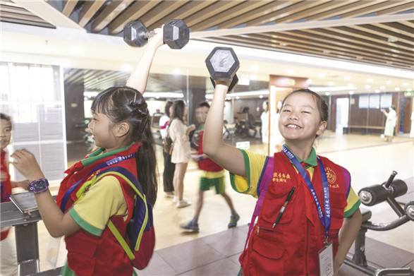 随后,在讲解员的带领下,学生记者们来到了生活区。这里环境幽雅,绿树成荫,干净整洁。在功能齐全的健身馆里,看!学生记者们忍不住大显身手,有的举起了哑铃,有的上了跑步机,还有的打起了乒乓球……“原来中铁四局的叔叔阿姨们,不仅爱岗敬业,让人敬重,同时他们也是一群热爱生活的人,健康生活,努力工作,是我们的榜样,值得我们学习!”有学生记者忍不住感慨道。