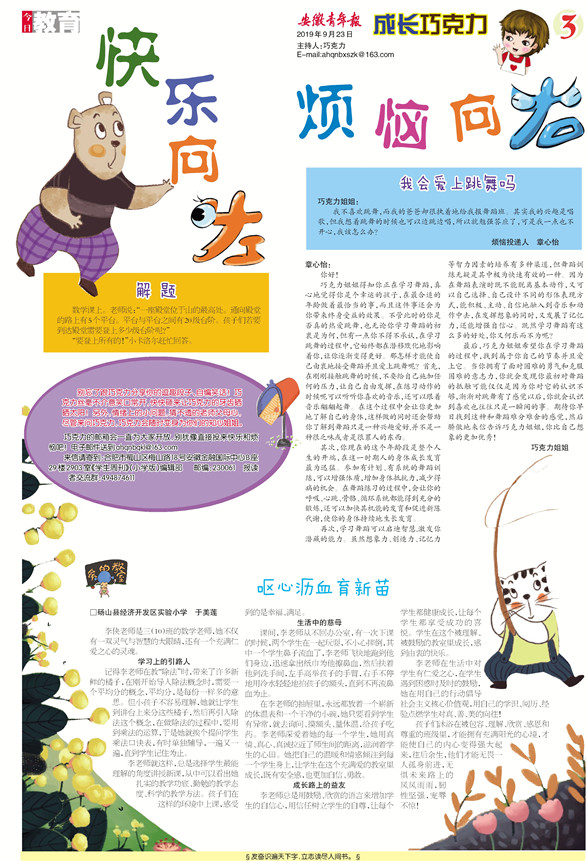 爱的教室 呕心沥血育新苗 □砀山县经济开发区实验小学 于美莲 李侠老师是三(10)班的数学老师,她不仅有一双灵气与智慧的大眼睛,还有一个充满仁爱之心的灵魂。 学习上的引路人 记得李老师在教“除法”时,带来了许多新鲜的橘子,在刚开始导入除法概念时,需要一个平均分的概念,平均分,是每份一样多的意思。但小孩子不容易理解,她就让学生到讲台上来分这些橘子,然后再引入除法这个概念,在做除法的过程中,要用到乘法的运算,于是她就挨个提问学生乘法口诀表,有时单独辅导,一遍又一遍,直到学生记住为止。 李老师就这样,总是选择学生最能理解的角度讲授新课,从中可以看出她扎实的教学功底、勤勉的教学态度、科学的教学方法。孩子们在这样的环境中上课,感受到的是幸福、满足。 生活中的慈母 课间,李老师从不回办公室,有一次下课的时候,两个学生在一起玩耍,不小心摔倒,其中一个学生鼻子流血了,李老师飞快地跑到他们身边,迅速拿出纸巾为他擦鼻血,然后扶着他到洗手间,左手高举孩子的手臂,右手不停地用冷水轻轻地拍孩子的额头,直到不再流鼻血为止。 在李老师的抽屉里,永远都放着一个崭新的体温表和一个干净的小碗,她只要看到学生有异常,就去询问、摸额头、量体温,给孩子吃药。李老师深爱着她的每一个学生,她用真情、真心、真诚拉近了师生间的距离,滋润着学生的心田。她把自己的温暖和情感倾注到每一个学生身上,让学生在这个充满爱的教室里成长,既有安全感,也更加自信、勇敢。 成长路上的益友 李老师总是用鼓励、欣赏的语言来增加学生的自信心,用信任树立学生的自尊,让每个学生都健康成长,让每个学生都享受成功的喜悦。学生在这个被理解、被鼓励的教室里成长,感到由衷的快乐。 李老师在生活中对学生有仁爱之心,在学生遇到困惑时及时的鼓励,她在用自己的行动倡导社会主义核心价值观,用自己的学识、阅历、经验点燃学生对真、善、美的向往! 孩子们沐浴在被包容、理解、欣赏、感恩和尊重的班级里,才能拥有充满阳光的心境,才能使自己的内心变得强大起来,往后余生,他们才能无畏一人孤身前进,无惧未来路上的风风雨雨,韧性坚强,宠辱不惊!